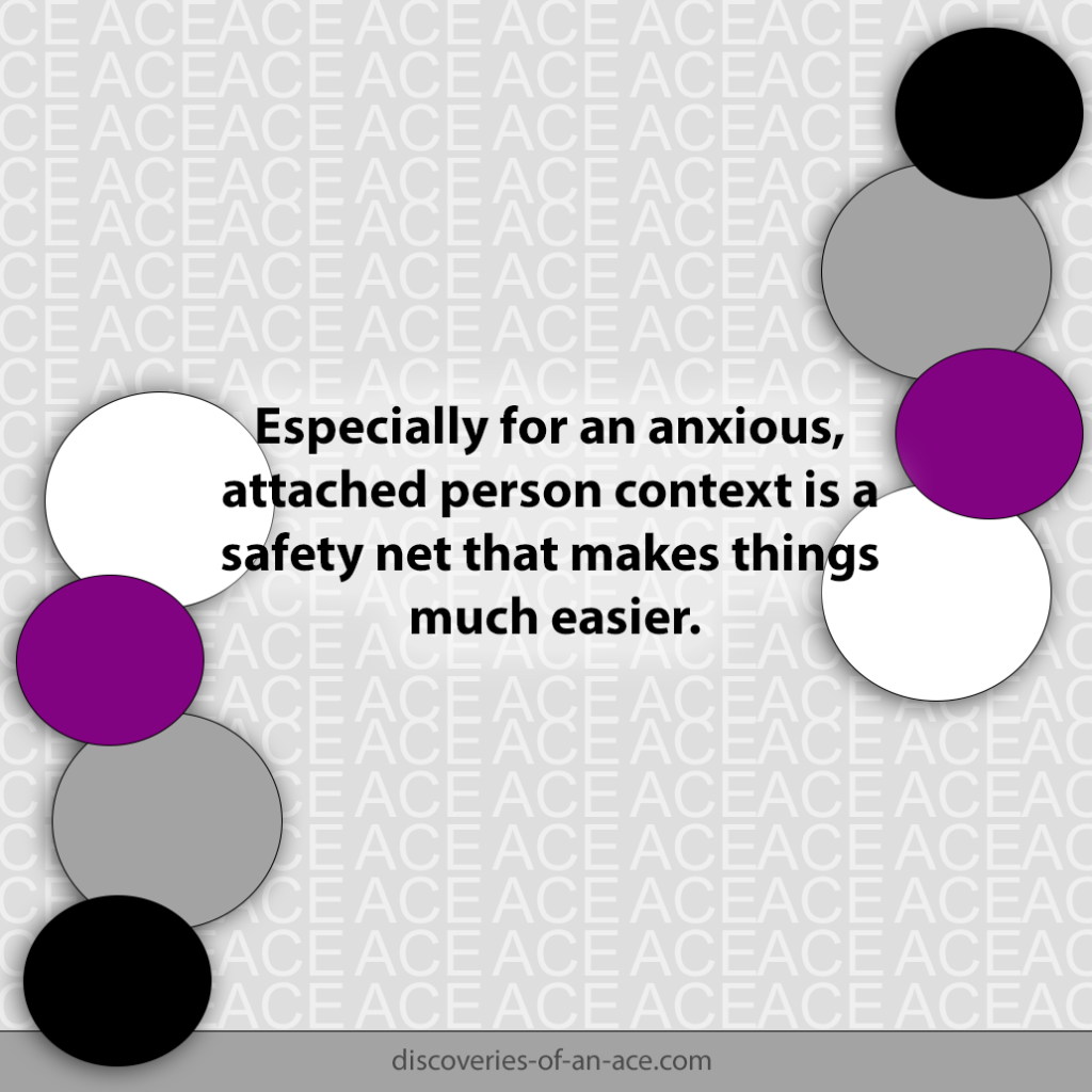 Besonders für eine ängstliche Person (mehr über Bindungsstile erfahren Sie in diesem Artikel: https://discoveries-of-an-ace.com/de/2025/06/21/warum-verhalte-ich-mich-in-beziehungen-so/) ist der Kontext ein Sicherheitsnetz, das vieles einfacher macht.